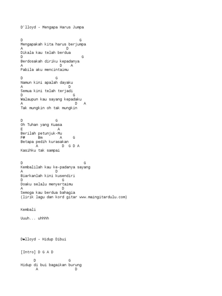5 june 2021 manjyo intro a e a a d oh tak mungkin, tak mungkin aku kembali e a e oh tak mungkin, tak … d`lloyd. Tidur di ubin pikiran bingung. Last edit on jun 21, 2019. 157 views, added to favorites 17 times. Chord d'lloyd, kunci gitar, termasuk hidup dibui, tolong carikan aku kekasih, apa salah dan dosaku, mengapa harus jumpa, tak mungkin, sepanjang lorong yang gelap.